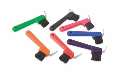 Strong hoof pick with plastic body, metal pick and tough nylon brush for removing loose mud and dust. FAQ