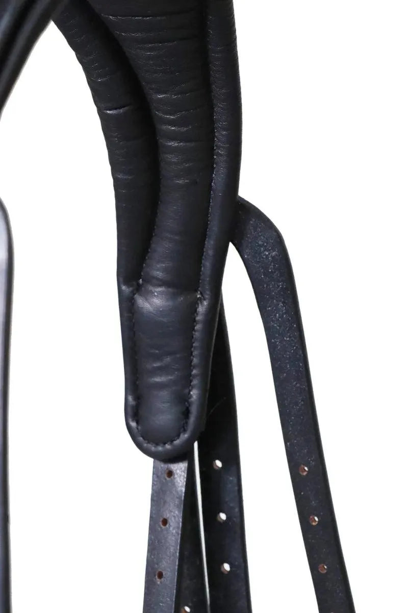 The throat lash strap has been strategically integrated into the headpiece to reduce the bulk in the sensitive TMJ area and allowing for the noseband and cheek piece buckles to lie flat against the horses skin.