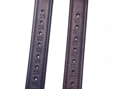 These stirrup leathers are super soft, non-stretch, and wrapped in calfskin with a nylon webbing centre for extra strength. They are plated at the top instead of stitched to allow the skirt of the saddle to sit flat, offering ultimate comfort under your leg and are suitable for any discipline with any saddle. These leathers feature 25 holes with 1/2" spacing for precision adjustment.
