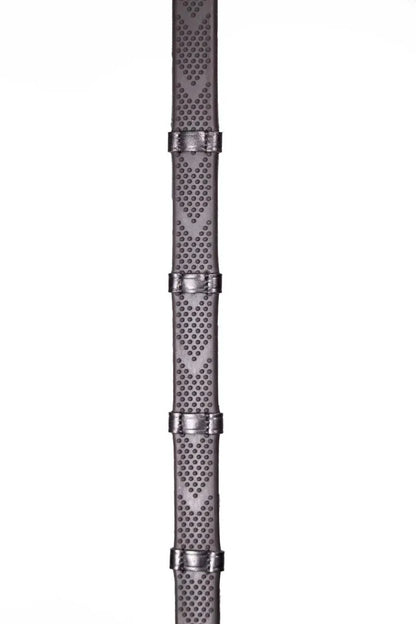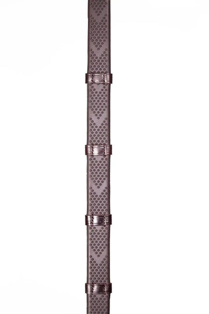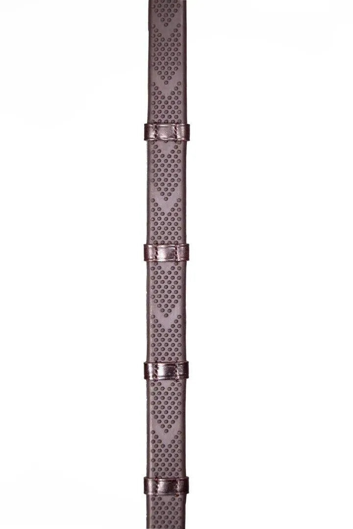 These reins feature small pimples in a chevron formation rubber pimples with hand stitched leather stoppers every 5cm. A very grippy & soft rein. The small bobbles are rounded on the top making them comfortable to hold with or without gloves.